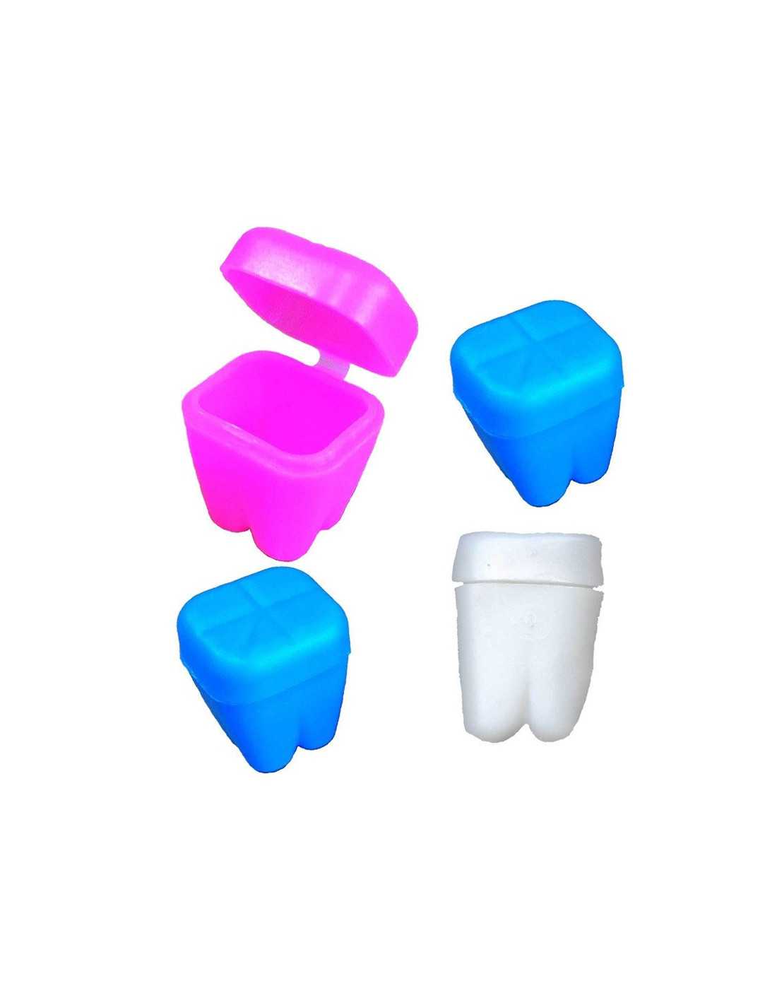 Mały kolorowy pojemnik na mleczaki w kształcie ząbka.