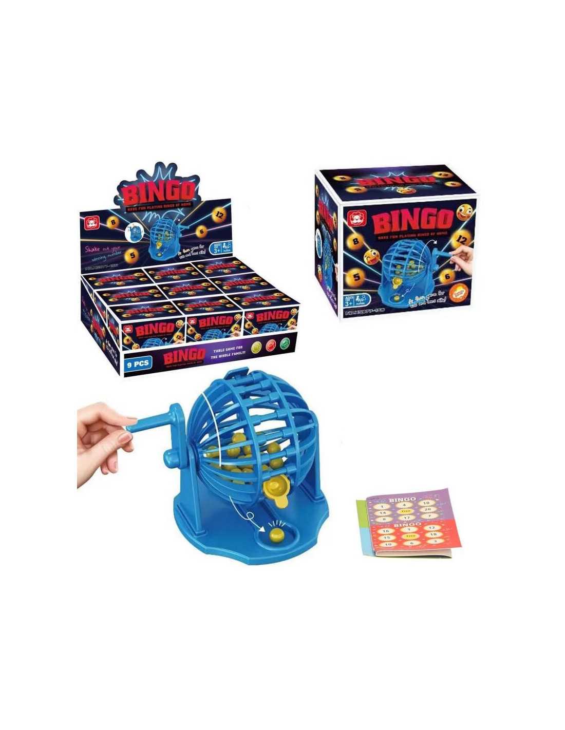 W zestawie: Niebieski bęben do losowania kulek. Zestaw ponumerowanych kulek. Bloczek kart Bingo.
