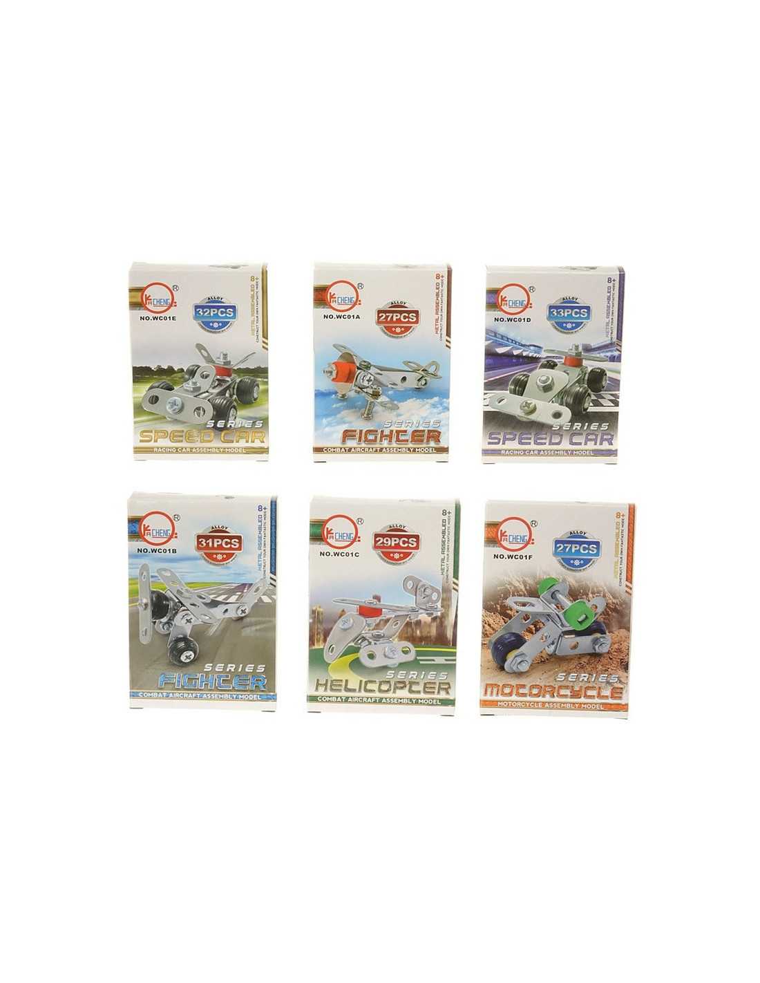Zestaw metalowych klocków do składania w kształcie pojazdów.