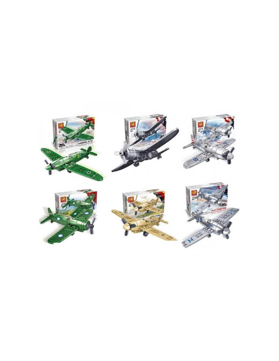Zestaw plastikowych klocków do składania w kształcie samolotów.
