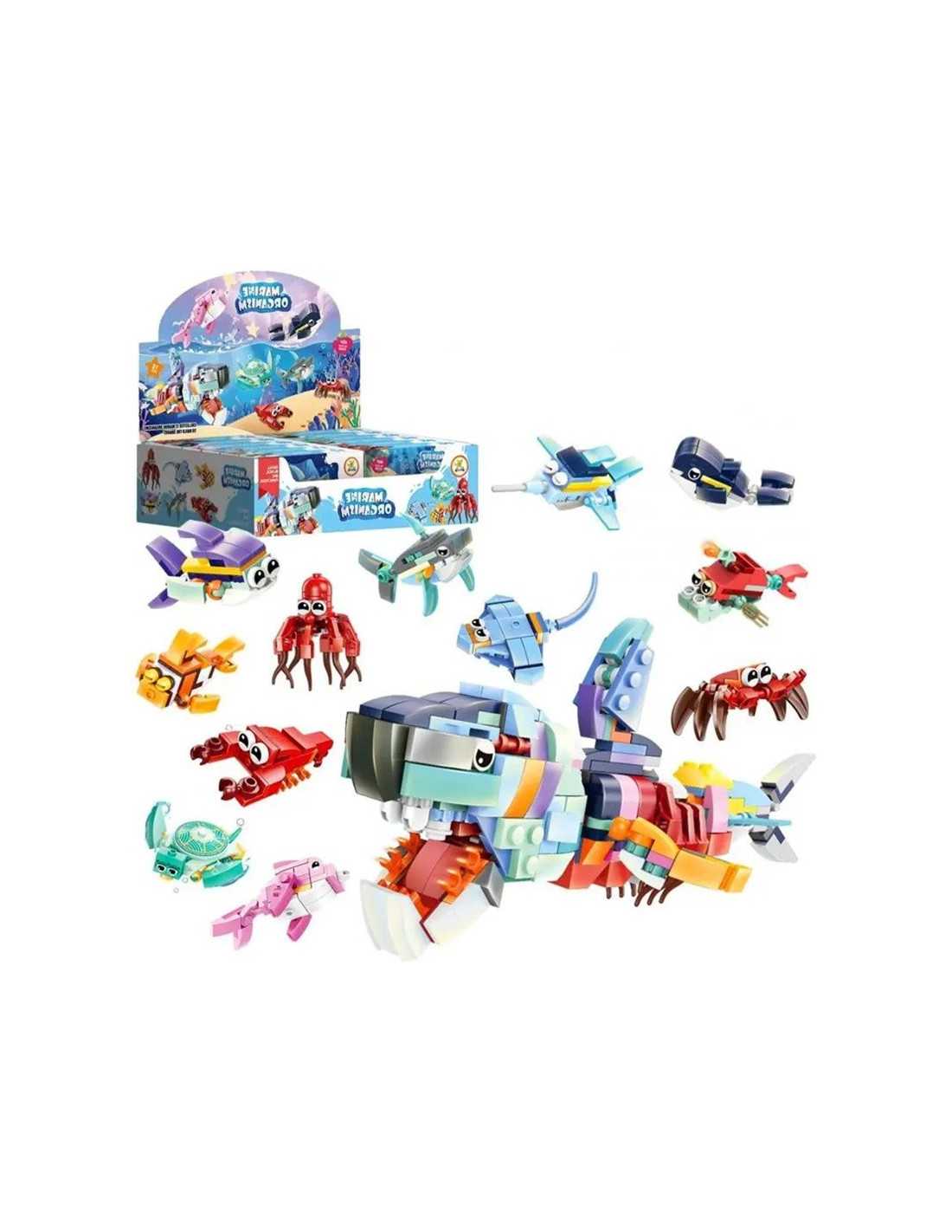 Zestaw klocków do składania w kształcie zwierzątek morskich.