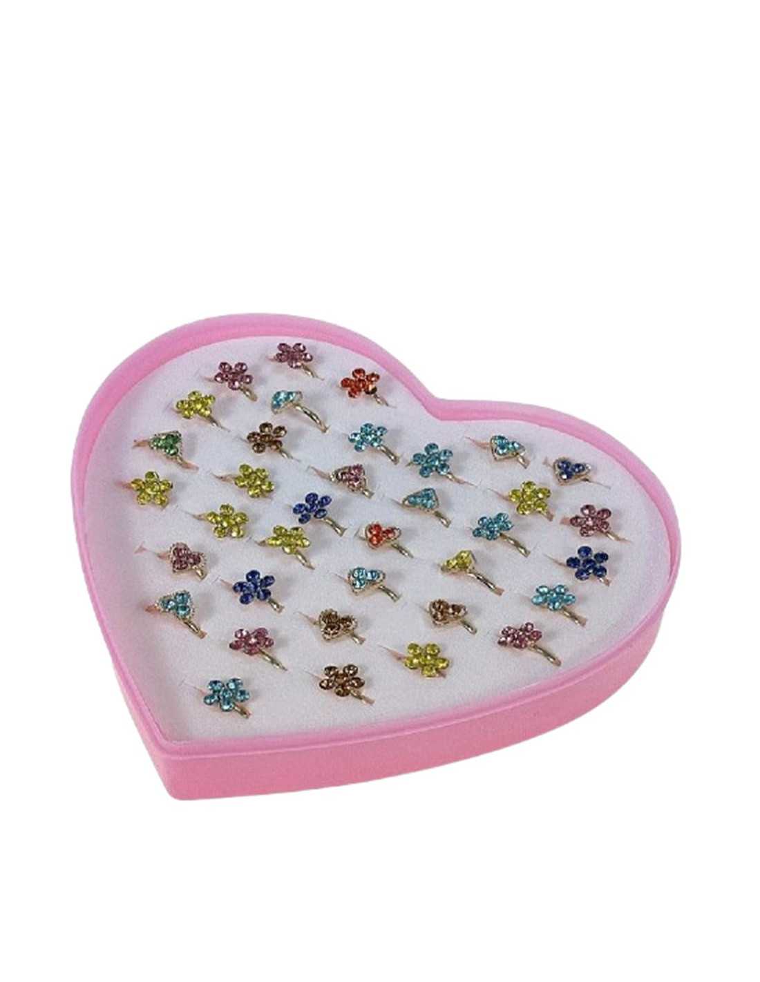 Zestaw pięknych pierścionków dziecięcych z regulacją w różowym pudełeczku w kształcie serca.