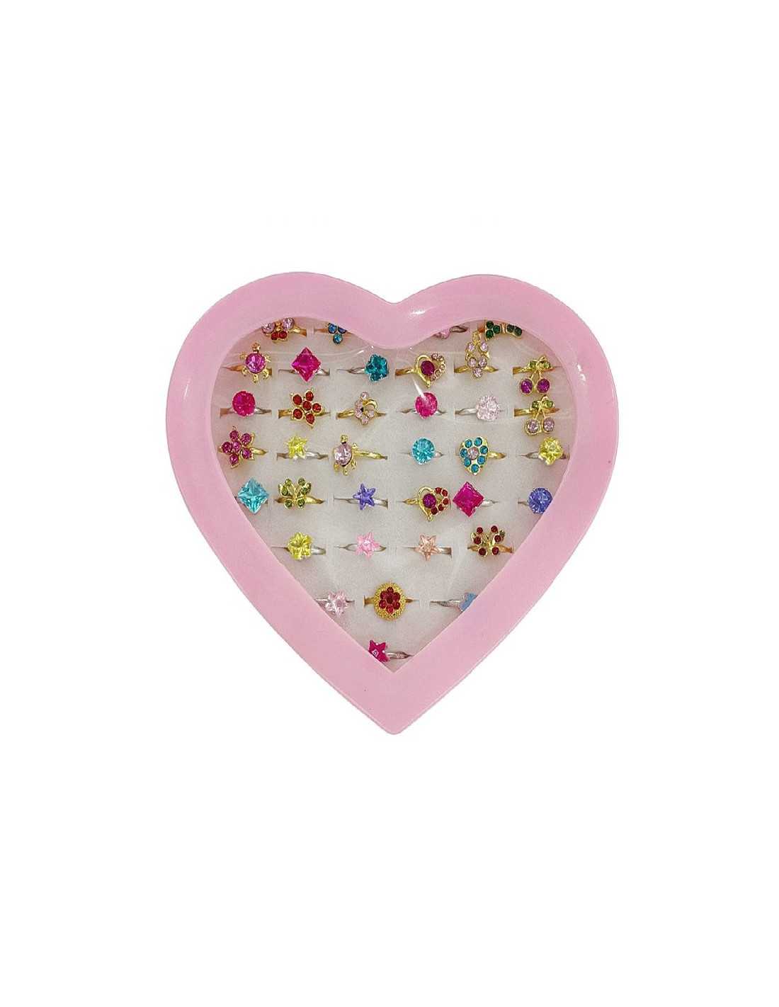 Zestaw pięknych pierścionków dziecięcych z regulacją w różowym pudełeczku w kształcie serca.