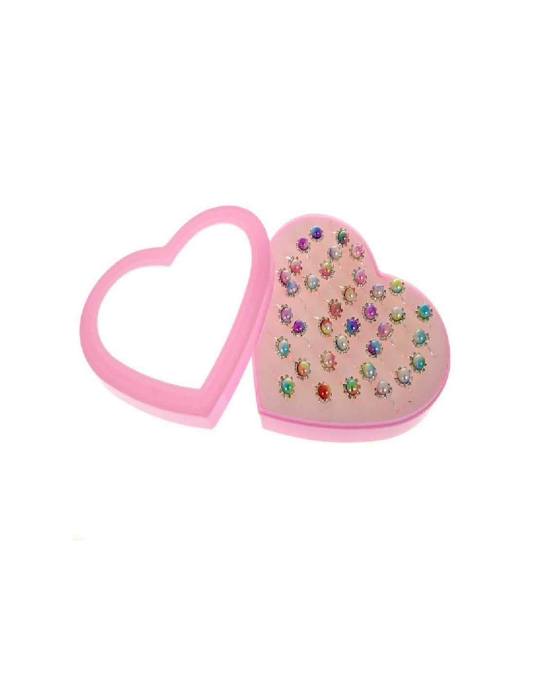 Zestaw pięknych pierścionków dziecięcych z regulacją w różowym pudełeczku w kształcie serca.