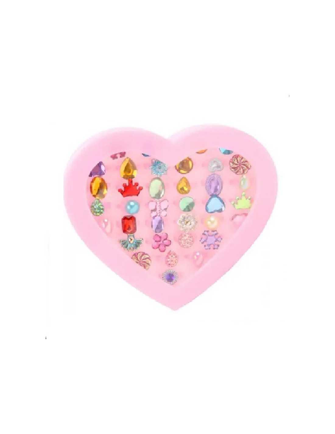 Zestaw pięknych pierścionków dziecięcych z regulacją w różowym pudełeczku w kształcie serca.