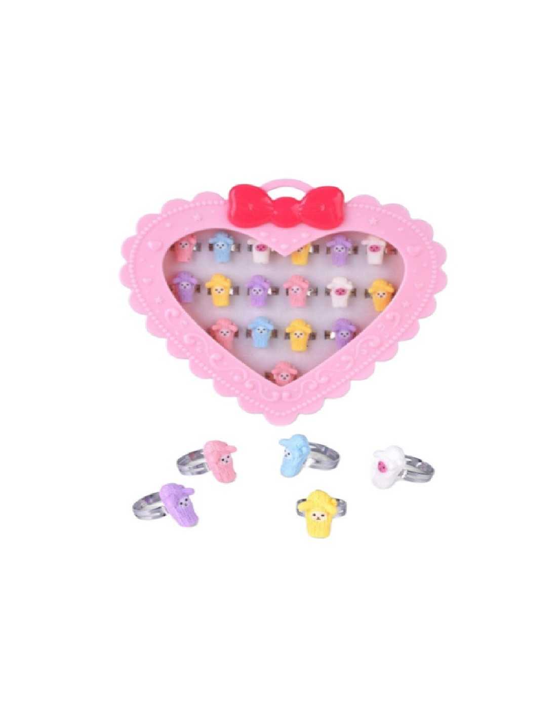 Zestaw pięknych pierścionków dziecięcych z regulacją w różowym pudełeczku w kształcie serca.