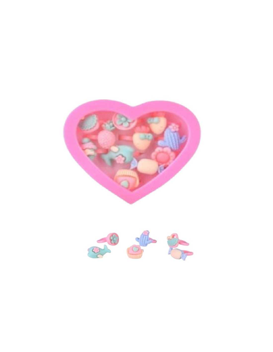 Zestaw pięknych pierścionków dziecięcych z regulacją w różowym pudełeczku w kształcie serca.