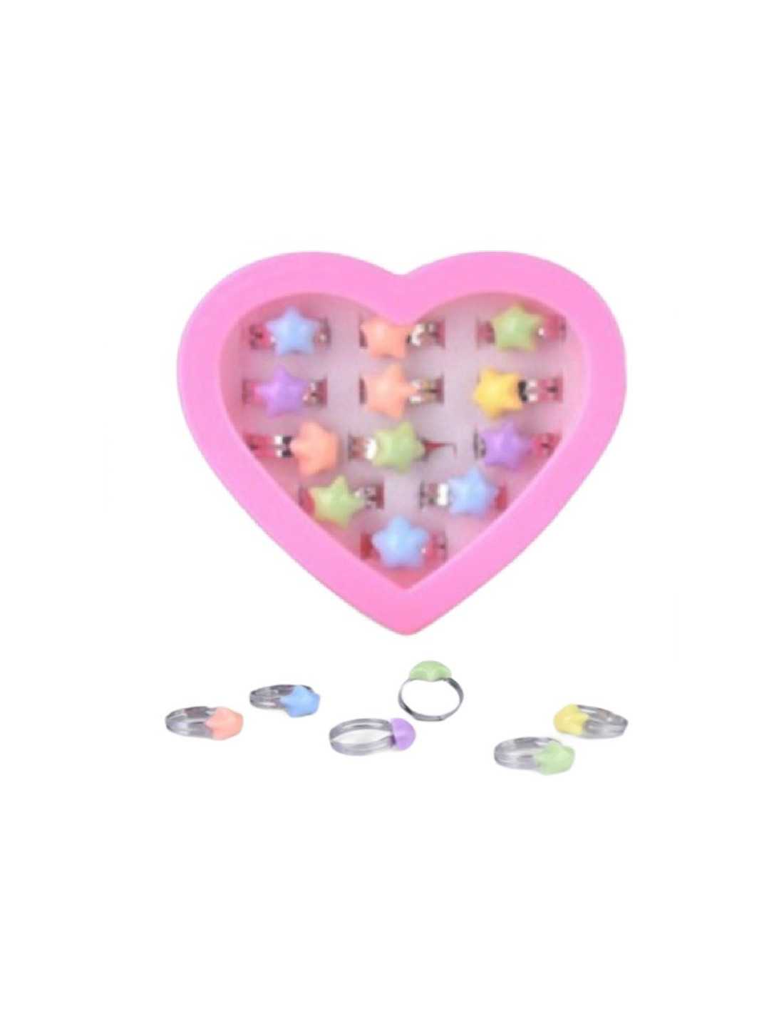 Zestaw pięknych pierścionków dziecięcych z regulacją w różowym pudełeczku w kształcie serca.