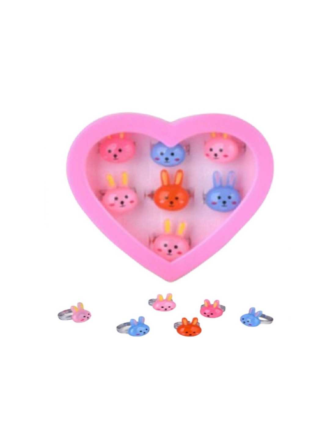 Zestaw pięknych pierścionków dziecięcych z regulacją w różowym pudełeczku w kształcie serca.