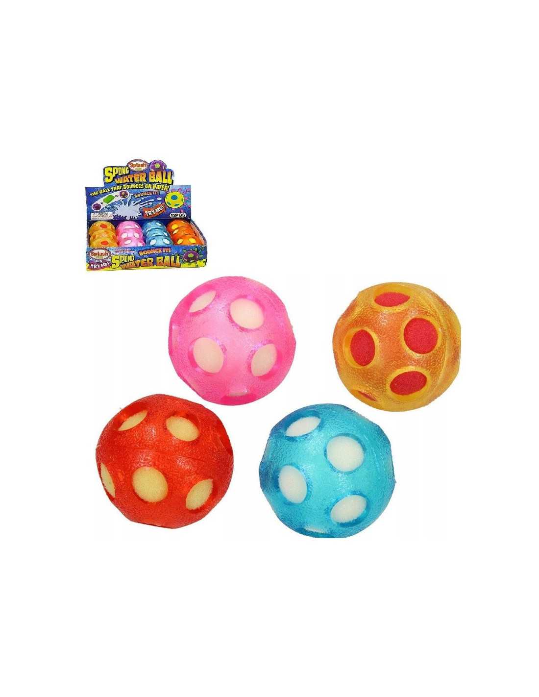 Kolorowa piłeczka z otworami i gąbka w środku.