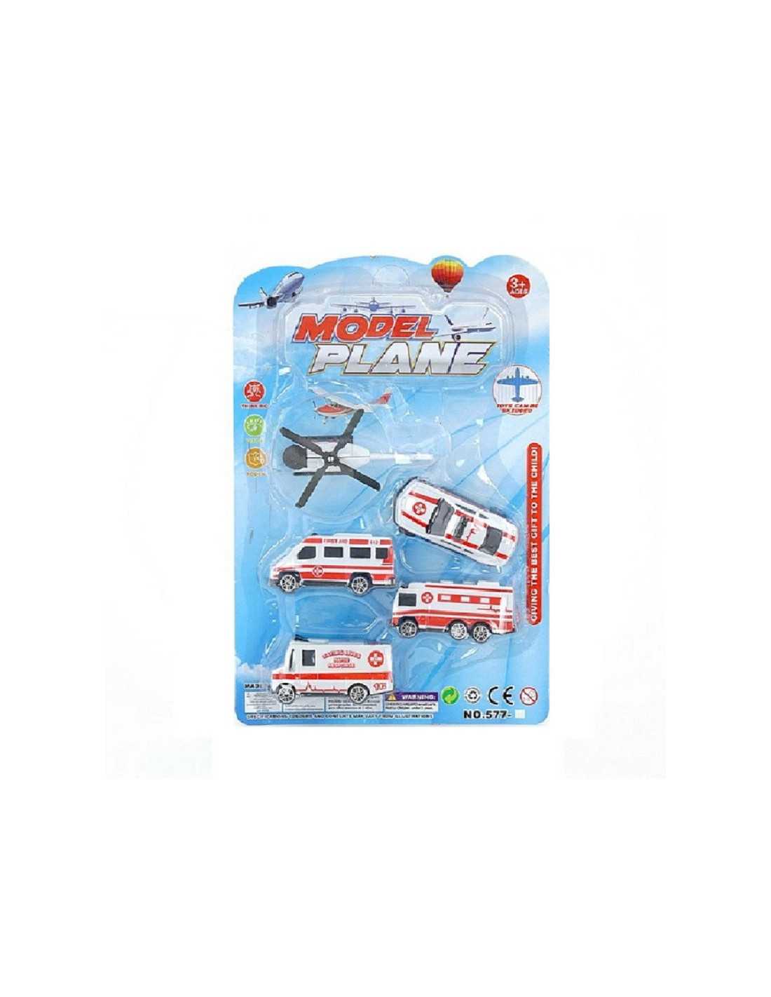Zestaw kolorowych plastikowych pojazdów pogotowia ratunkowego.