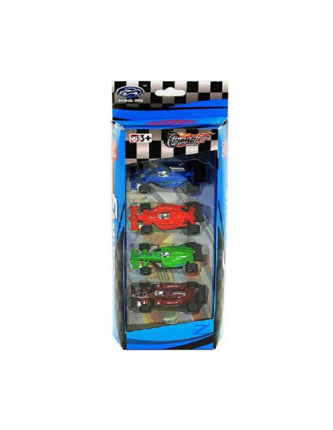 Zestaw kolorowych metalowych pojazdów wyścigowych.