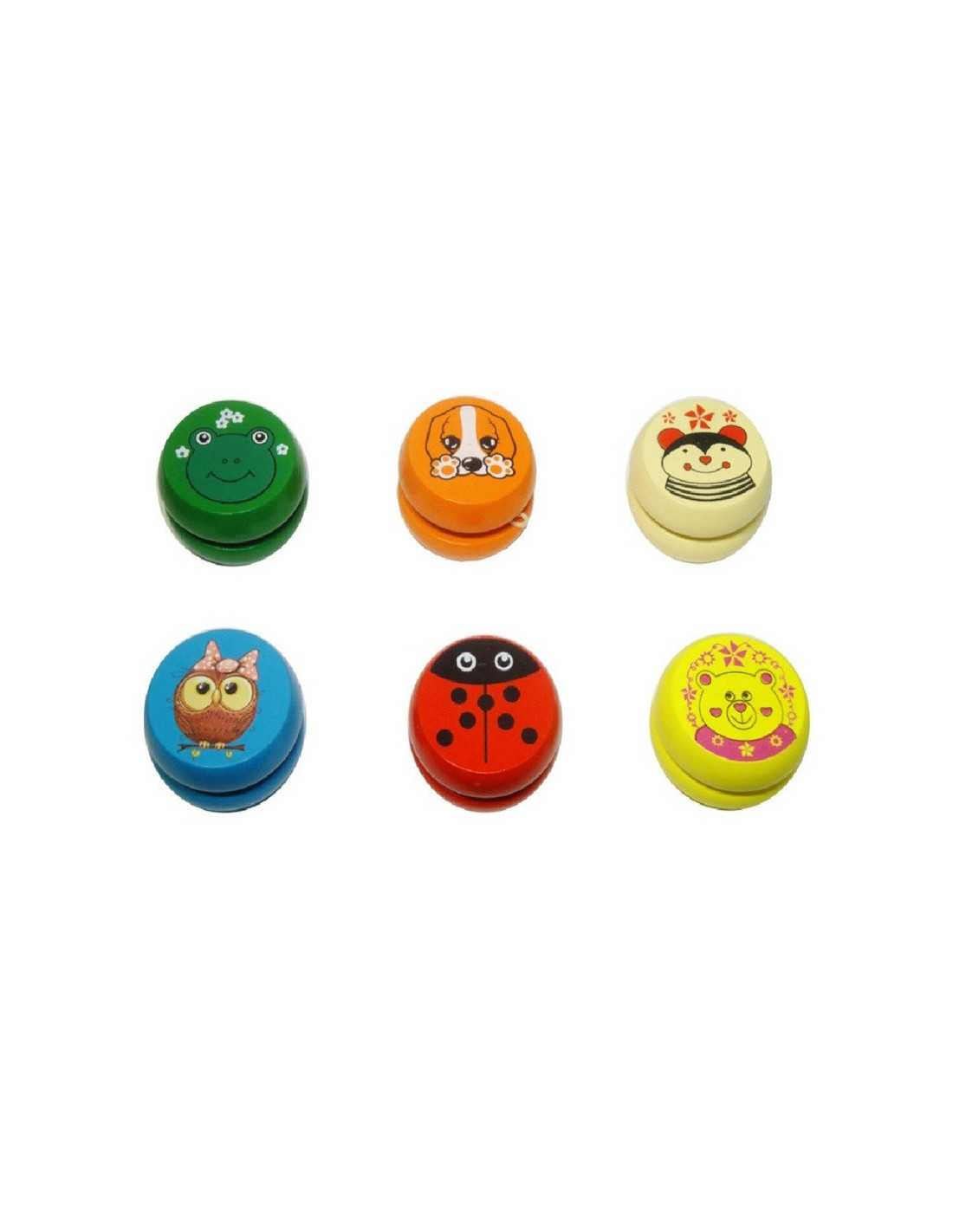 Kolorowe drewniane yoyo z obrazkiem zwierzątka.