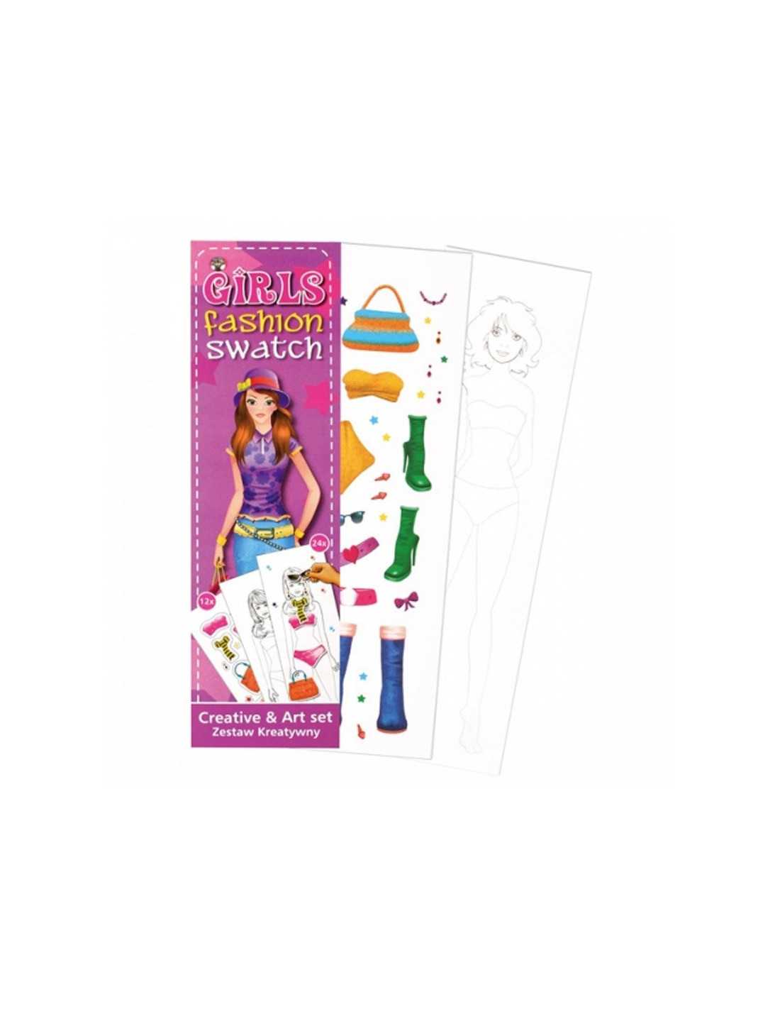 Produkt składający się z 36 stron na których znajdują się: 12 kartek z naklejkami elementów garderoby i dodatków oraz 24 szablony z konturami do wyklejania.