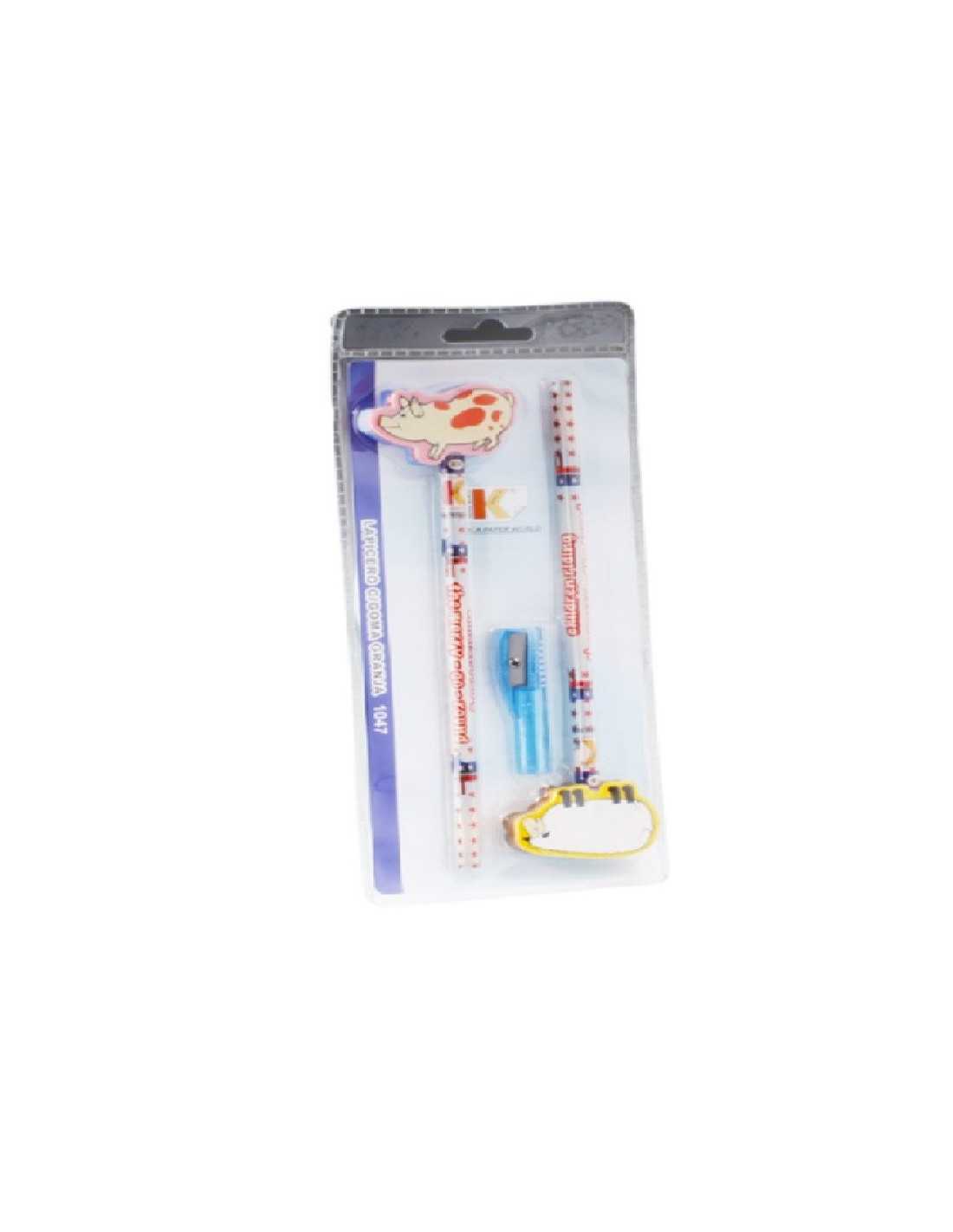 Zestaw  do szkoły dla dzieci z motywem zwierzątek w skład którego wchodzą: 2x ołówki, 2x gumki do mazania, temperówka.